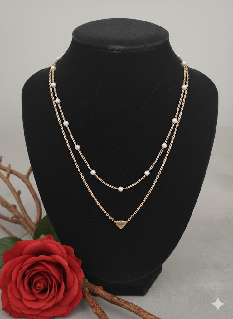 Ce collier double rang allie la délicatesse des perles à la symbolique du cœur. Conçu avec une chaîne fine et dorée, il offre un style superposé (layering) élégant et moderne, idéal pour un look romantique ou une occasion spéciale.